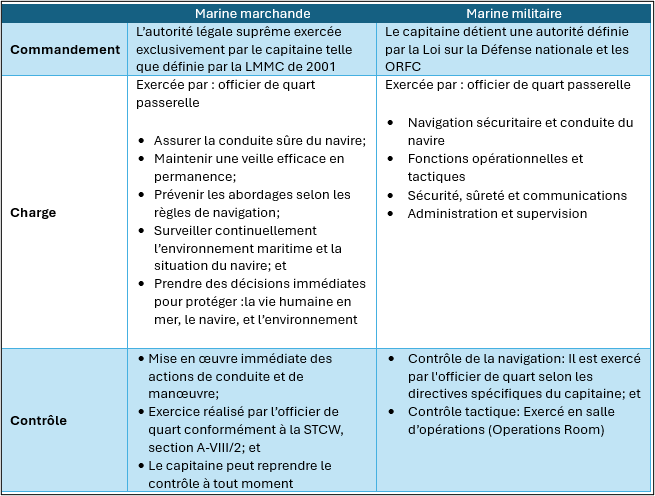 Commandement: Le commandement désigne l’autorité légale suprême exercée exclusivement par le capitaine, telle que définie par la LMMC de 2001. Il couvre la sécurité, la navigation, la cargaison, l’équipage et l’ensemble des opérations.